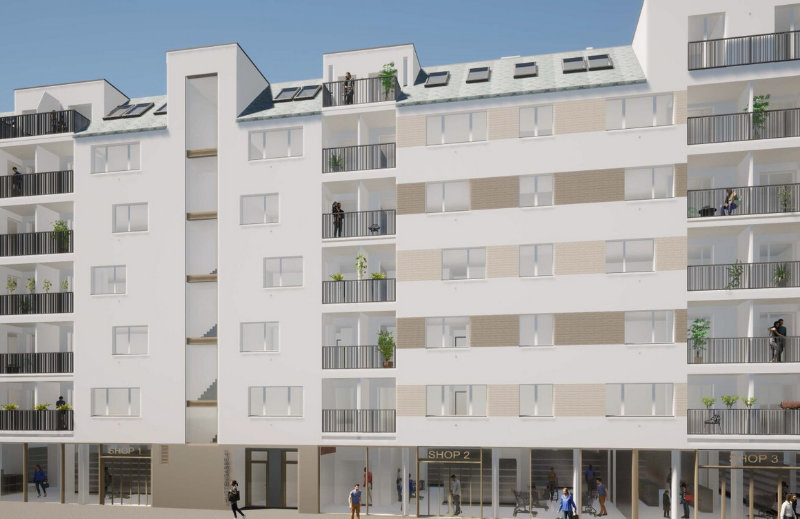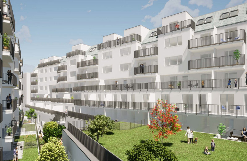 Jede Wohnung verfügt über eine private Freifläche, wie einen Garten mit Terrasse in den Innenhof, einen Balkon oder eine geschützte Loggia. © Buschina & Partner Ziviltechniker GmbH