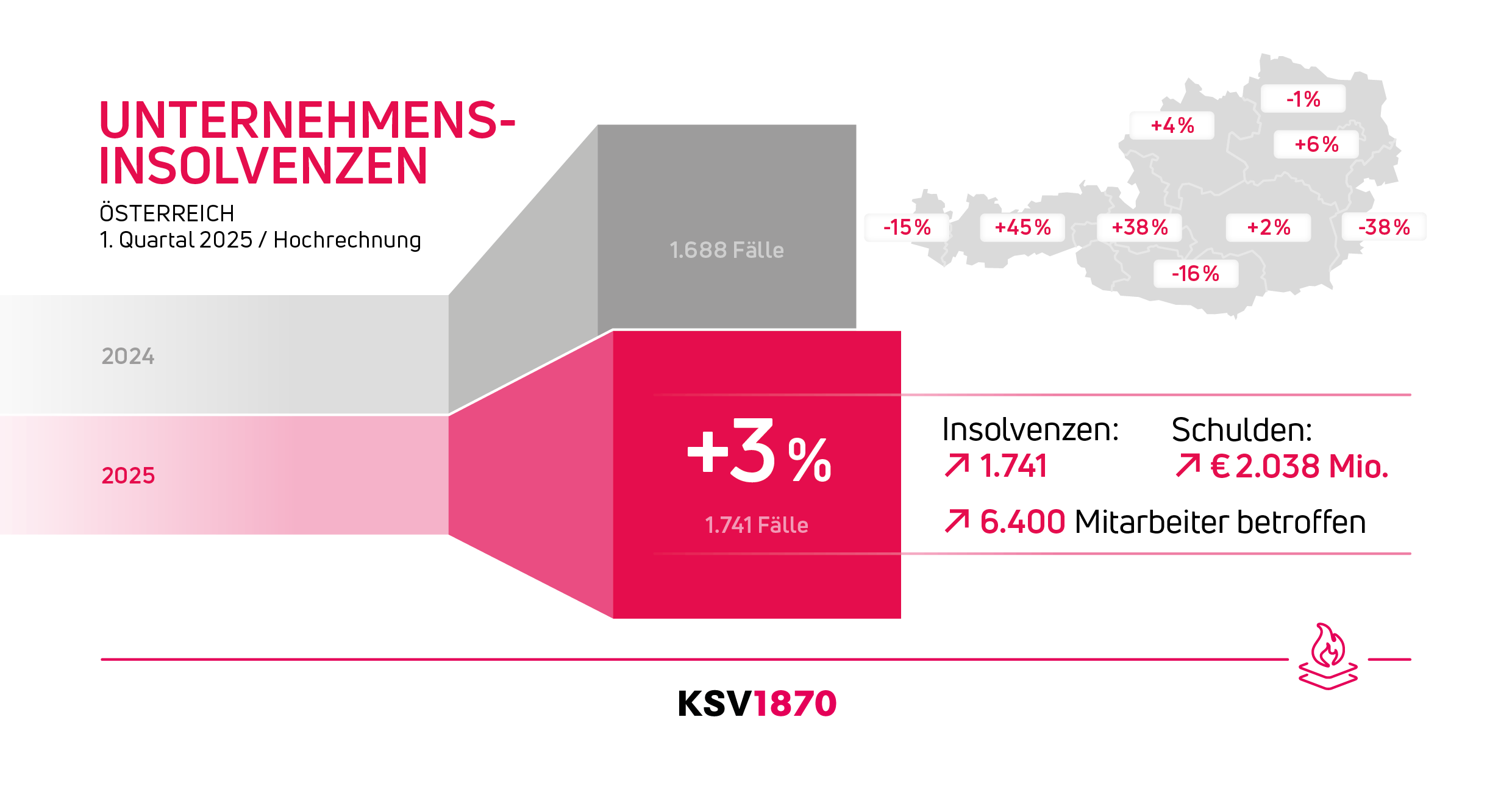 "Die aktuellen Zahlen bestätigen das Offensichtliche. Österreichs Wirtschaft geht weiterhin am Stock. Sie benötigt dringender denn je frischen Sauerstoff, um wieder in Schwung zu kommen", erklärt Karl-Heinz Götze, Leiter KSV1870 Insolvenz. Als Folge der anhaltenden Schwächephase mussten im ersten Quartal 2025 in Österreich 1.741 Unternehmen (+ 3,1 % gegenüber 2024) Insolvenz anmelden – davon wurden 647 Fälle (+ 8 %) mangels Kostendeckung nicht eröffnet.