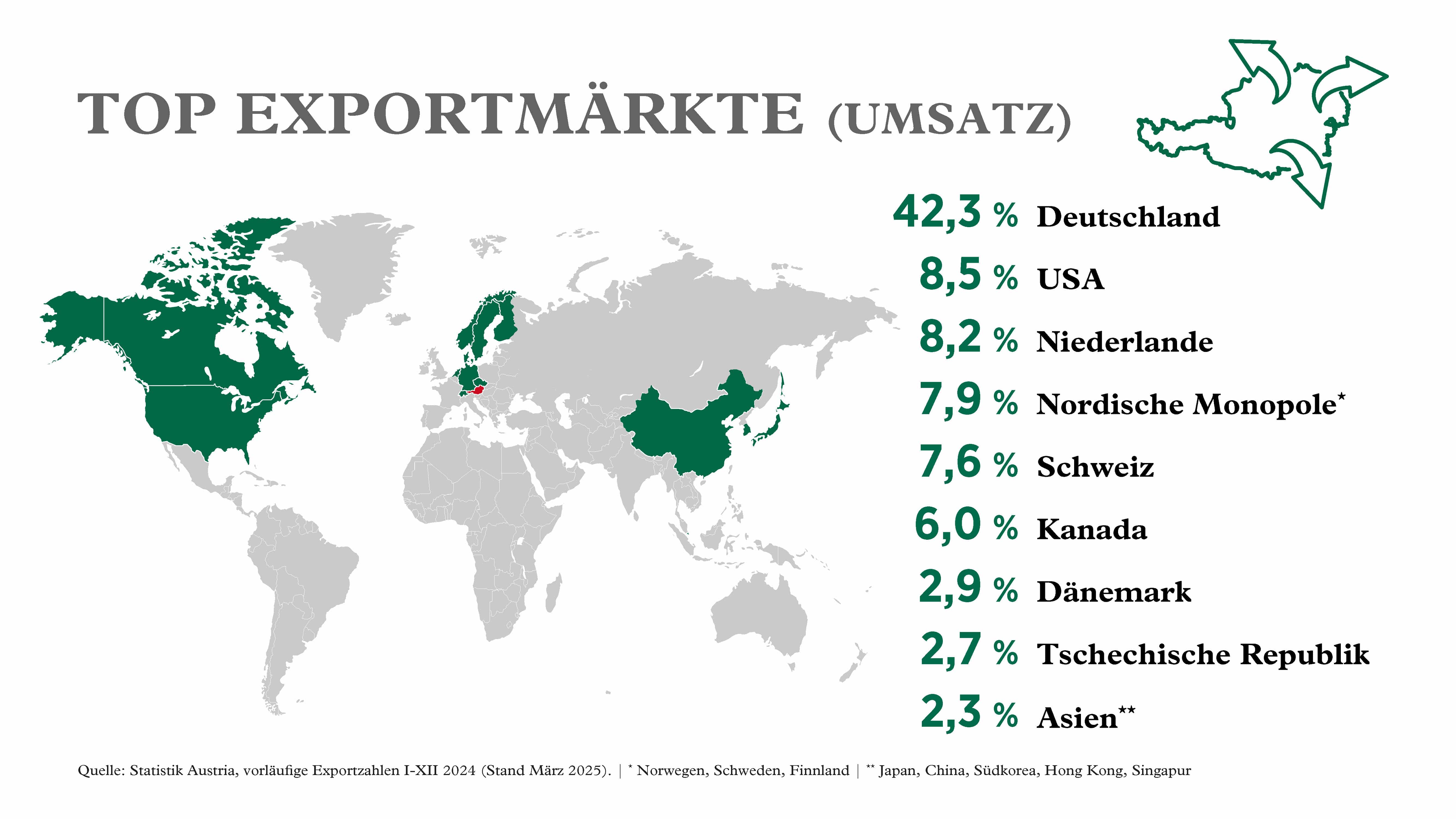 Konkret fiel der Exportwert in Deutschland durch den höheren Anteil preiswerter Tankweine um 13,6 Prozent auf 98,8 Millionen Euro. Er liegt aber weiterhin über dem Niveau von 2022 (94,5 Millionen Euro). Auch die exportierte Menge sank 2024 leicht um 4,4 Prozent. Dennoch bleibt Deutschland mit großem Abstand der wichtigste Exportmarkt für Österreich: 60,2 Prozent aller exportierten Weine gehen in die Bundesrepublik und generieren 42,3 Prozent des gesamten Exportwerts.