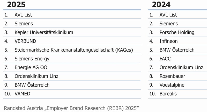 Stichwort Arbeitgeber-Attraktivität: Wie eingangs erwähnt, hat Randstad im Rahmen der Studie auch untersucht, welche Unternehmen auf Bewerber:innen aktuell besonders anziehend wirken. Laut "Employer Brand Research 2025" schafft AVL List das Triple (Gewinner 2023 bis 2025). Der Grazer Automobilzulieferer führt das Ranking der attraktivsten Arbeitgeber:innen heuer wieder vor Siemens an. Mit dem drittplatzierten Linzer Kepler Universitätsklinikum, der Verbund AG, der Steiermärkischen Krankenanstaltengesellschaft (KAGes), Siemens Energy und der Energie AG OÖ (4. bis 7. Platz) schaffen es fünf Aufsteiger zurück unter die besten zehn Arbeitgeber:innen. Das Ordensklinikum Linz, BMW Österreich und Vamed belegen im Randstad-Ranking die Plätze 8 bis 10.