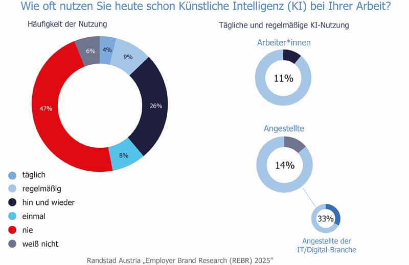 Laut EU AI-Act müssen seit 2. Februar 2025 alle Mitarbeitenden, die Künstliche Intelligenz (KI) nutzen, entwickeln oder betreiben, über ausreichende KI-Kompetenzen verfügen. Aber wie verbreitet ist KI bei den heimischen Beschäftigten schon im Einsatz, welche Unterschiede gibt es zwischen den Generationen und wie sehen sie die Auswirkungen auf ihren Job? Das hat Randstad in seiner heurigen Arbeitsmarktstudie "Employer Brand Research 2025" als Jahresschwerpunkt untersucht (siehe Infobox). Wie jedes Jahr hat der internationale Personaldienstleister zudem ein Ranking der attraktivsten Arbeitgeber:innen aus Sicht potenzieller Bewerber:innen veröffentlicht.