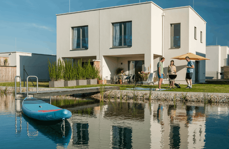 Die vom Architekturbüro Holzbauer & Partner ZT GmbH geplanten Einfamilien-, Doppel- und Reihenhäuser sind in acht verschiedenen Grundrisstypen zwischen 113 und 132 m² Wohnnutzfläche und 4 bis 5 Zimmer erhältlich. Alle Häuser haben einen eigenen Garten, unmittelbar am See. Der Zugang zum erfrischenden Nass erfolgt über einen Privatsteg. Die Grundstücke sind parzelliert. Damit wird jedes Haus samt Garten im Alleineigentum erworben – eine Rarität bei Projekten dieser Größenordnung.