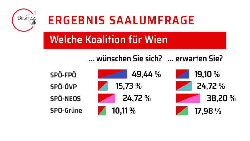 Bei dieser Gelegenheit wurde dann auch gleich eine Umfrage unter den rund 80 prominenten Besucher:innen durchgeführt. Das anwesende Saalpublikum und die Zuseher:innen auf Puls24, wo das Interview ausgestrahlt wurde, konnten über mögliche Koalitionen für Wien abstimmen. Es wurden zwei Fragen gestellt, welche Koalition wünschen Sie sich für Wien und welche erwarten Sie?