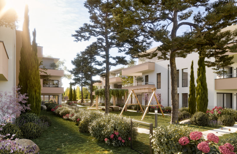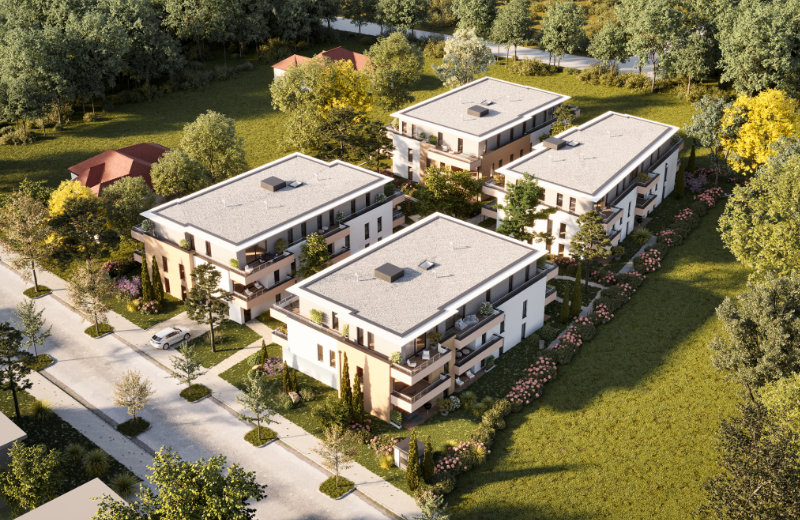 Die vier Punkthäuser werden durch Grünflächen und eine gemeinsame Tiefgarage mit 75 Stellplätzen ergänzt © Christian Pichlkastner