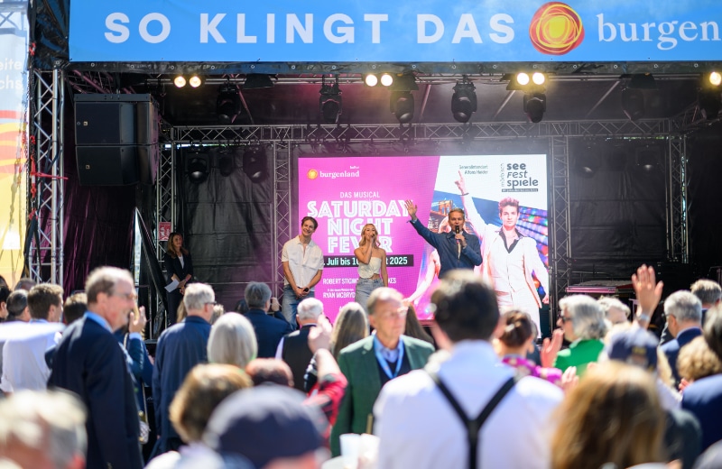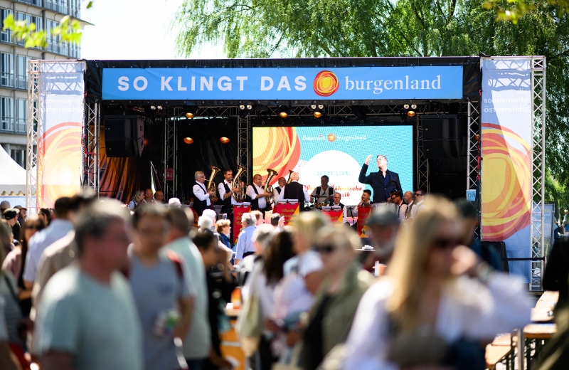 Anschließend begaben sich rund 80 geladene Gäste, darunter Vertreter:innen aus dem Burgenland und Hamburg, an Bord der Barkasse "Diplomat", um den Burgenland-Auftritt an der Kehrwiederspitze offiziell zu eröffnen. Dort angekommen wurde das Österreich-Burgenland Festival gemeinsam mit Medien, Partner:innen und zahlreichen Besucher:innen offiziell eingeleitet. Dabei begrüßte Hamburgs Senatorin für Wirtschaft und Innovation, Melanie Leonhard, neben Landesrat Leonhard Schneemann u. a. auch Wirtschaftskammerpräsident Andreas Wirth sowie den österreichischen Botschafter in Berlin, Alexander Marschick, als Gäste auf der Festivalbühne. Abgerundet wurde der offizielle Festakt durch den symbolischen Austausch von Gastgeschenken zwischen Hamburg und dem Burgenland.