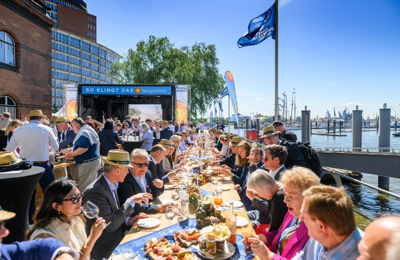 Nach dem offiziellen Teil ließen die burgenländischen Delegationen den Nachmittag gemeinsam mit den Hamburger Gästen an der längsten Heurigentafel Deutschlands bei burgenländischen Schmankerln ausklingen. Neben regionalen Spezialitäten und feinen burgenländischen Weinen, die von Wein Burgenland präsentiert wurden, wurde den Besucher:innen auch musikalische Unterhaltung geboten. Highlight war dabei ein Live-Auftritt der burgenländischen Indie-Band Garish, die auch in Deutschland eine treue Fangemeinde hat.