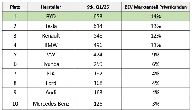 Am Gesamtmarkt lag BYD im ersten Quartal 2025 bei den reinen Elektroautos in Österreich übrigens auf Platz drei – hinter BMW und VW sowie vor Tesla und Audi.