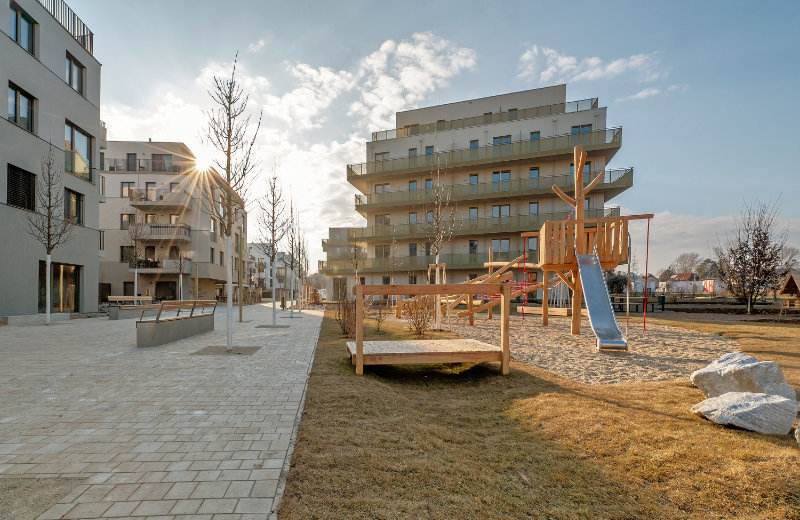 Etwa zwei Drittel des insgesamt rund 2,6 Hektar großen Quartiers stehen den Bewohner:innen als Grün- und Freiflächen zur Verfügung. Eine Esplanade mit Allee verbindet die Gebäude mit dem zentralen Quartiersplatz. Ein großer Jugendspielplatz liegt direkt vor dem angrenzenden Wald- und Wiesengebiet. Zusätzlich gibt es drei Kleinkinderbereiche.