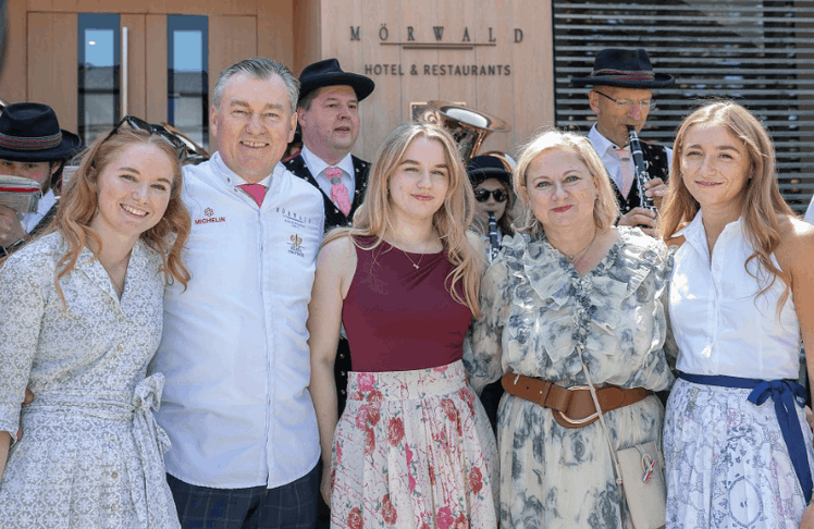 Zur feierlichen Eröffnung ist eine Vielzahl an Gästen erschienen, die von den Mörwald-Töchtern Antonia, Johanna und Theresia durch den Mittag geführt wurden. Die Anwesenden erhielten tiefreichende Einblicke in die Planung und Bauzeit des Gutshofes. Unterstützt wurden die Frauen dabei von anderen Redner:innen – darunter auch die Architekt:innen des Projekts, die mit detaillierten Ausführungen zur architektonischen Vision und den baulichen Herausforderungen den Zuhörer:innen neue Perspektiven eröffneten.