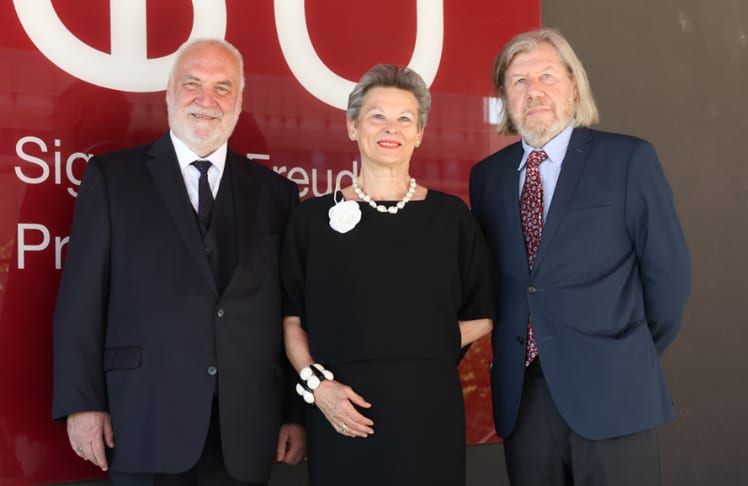 Die weiteren Festredner:innen vermittelten ein Bild der thematischen Breite, in der die SFU als Institution gesellschaftlich wirksam ist. Martin Rummel, Rektor der Anton Bruckner Privatuniversität und Vorsitzender der Österreichischen Privatuniversitäten Konferenz (ÖPUK), wies auf die zentrale Bedeutung des privaten Hochschulsektors für die Freiheit und Unabhängigkeit der Wissenschaft und damit für den Erfolg des Hochschulstandortes hin. Michael Kierein, langjähriger Leiter der Abteilung für Rechtsangelegenheiten ÄrztInnen, Psychologie, Psychotherapie und Musiktherapie im Bundesministerium für Arbeit, Soziales, Gesundheit und Konsumentenschutz, schloss an die Worte des Bundespräsidenten an und lobte die SFU als Ort des gelebten Humanismus. Dieses Projekt wäre, so Kierein weiter, undenkbar ohne die persönlichen Leistungen der Gründungsmitglieder Alfred Pritz, Jutta Fiegl, Heinz Laubreuter und Elisabeth Dokulil (vormals Vykoukal). Gabriele Brinek, Volksanwältin a.D. und Vorsitzende des Universitätsrates der SFU, zeichnete in ihrer Rede die herausragende Rolle der SFU und von Alfred Pritz bei der Etablierung und Weiterentwicklung der Psychotherapie in Österreich nach.