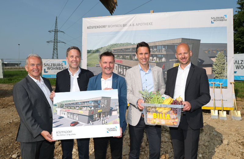 V.l.n.r.: Bürgermeister Wolfgang Wagner, Thomas Maierhofer (Salzburg Wohnbau), Landesrat Martin Zauner, Georg Grundbichler (Salzburg Wohnbau) und Bernhard Kreuzer (Billa) © Neumayr