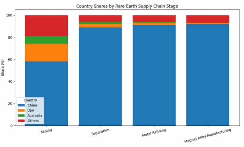 Chinas Dominanz in der Wertschöpfungskette von Permanentmagneten – vom Rohstoffabbau über die Trennung bis hin zur Metallveredelung und Produktion © ASCII