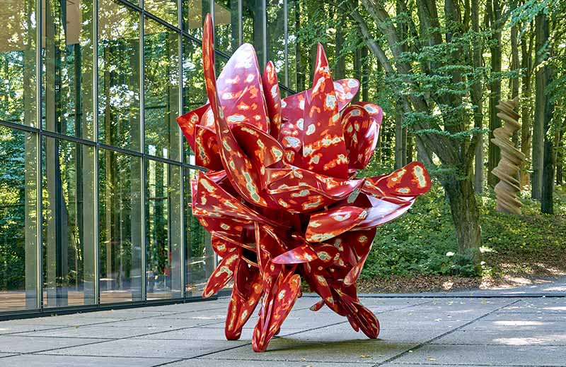 Die im Skulpturenpark Waldfrieden in der oberen Ausstellungshalle gezeigte Großskulptur aus der Reihe "Industrial Nature" greift das Themenfeld Natur und Technik auf: Gefertigt aus geschnittenen und gebogenen Aluminiumplatten, die mit Lackfarbe überzogen und partiell abgeschliffen ist, erscheint sie wie ein technisch reproduzierbares Gewächs. Ihr voluminöser Körper tritt in einen Dialog mit einer Skulptur der Reihe "Hedge", die fast ebenso groß, doch weitaus filigraner konstruiert ist. Akkumuliert aus schmalen Formen aus Cortenstahl expandieren sie organisch wie eine Hecke in Höhe und Breite. Die Arbeiten der Reihe "Incidents", die aus den "Hedges" hervorgegangen sind, balancieren auf drei Beinen stehend in die Vertikale, wo sich dann ihre organischen Formen ausdifferenzieren. Monumental zeigen sich die beiden Skulpturen aus der Reihe "Lost in Thought": Aus Holz gefräste Elemente verdichten sich zu einem amorphen Körper, der Ausmaße von bis zu vier mal drei mal zwei Metern erreicht.