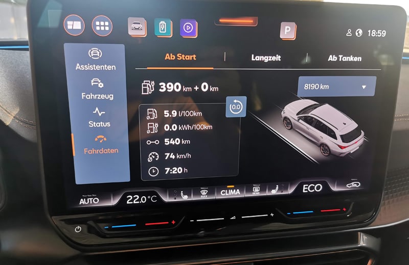 Im Cockpit setzt Leon SP Kombi auf eine fast knopflose Bedienung, was etwas Eingewöhnung erfordert, nach einiger Zeit aber gut funktioniert. Die Sprachsteuerung arbeitet brauchbar, aber nicht perfekt, ebenso die Verkehrszeichenerkennung. Am Lenkrad gibt es zum Glück haptische Tasten und keine Sensorfelder, was der intuitiven Bedienung sehr zugutekommt. Den sportlichen Anspruch unterstreichen der Start- und Fahrmodi-Knopf, die ebenfalls im Volant integriert sind. Der teilautonome Fahrassistent ist auf der Autobahn eine echte Erleichterung: Er hält souverän Spur und Abstand, beschleunigt und bremst harmonisch und funktioniert auch bei Regen tadellos. Die Lenkung ist präzise, das Fahrwerk sportlich, aber komfortabel, und die Bremsen vermitteln Sicherheit. Auf langen Strecken bleibt der Leon leise und stabil, was ihn zu einem angenehmen Begleiter macht.