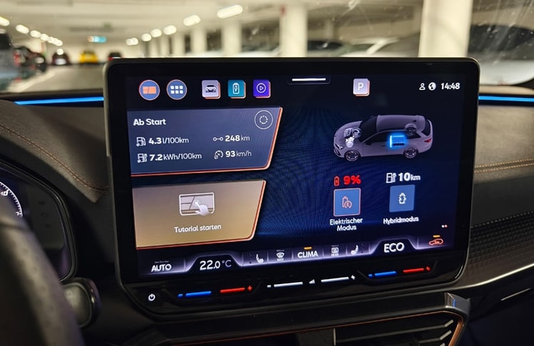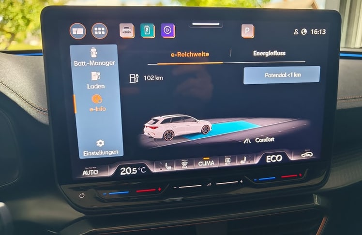 Für viele Kund:innen, die sich für einen Teilzeitstromer interessieren, dürfte aber ohnehin die Effizienz mehr zählen als der reine Fahrspaß. Und diesbezüglich gibt sich dieses Modell keine Blöße. Auf einer 560 km langen Testfahrt zeigte der Leon seine effiziente Seite. Mit aufgeladener Batterie lag der Verbrauch bei 4,3 bis 4,5 Liter Super und rund 7 kWh auf 100 km, mit leerem Akku zwischen 5,9 bis 6,5 Liter auf 100 km. Bei der Rekuperation gibt es drei Stufen, die Automatische ist empfehlenswert. In dieser bremst der Kombi vor Kreisverkehren oder Ortseinfahrten selbstständig via Bremsenergierückgewinnung, lädt dabei die Batterie und stellt bei der anschließenden Beschleunigung ausreichend E-Power bereit, selbst wenn die Batterie eigentlich schon leer ist. Auf der Autobahn funktioniert das ebenso, was sich positiv auf den Langstreckenverbrauch auswirkt. Die Schnellladefähigkeit (DC 50 kW) macht den Plug-in-Hybrid deutlich alltagstauglicher als viele Wettbewerber. Und auch die seit dem Facelift deutlich größere Batterie verdient viel Lob. Versprochen werden bis zu 125 km rein elektrisch. Nach einer Vollladung zeigte der Cupra im Test eine elektrische Reichweite von 102 km an und diese haben wir tatsächlich erreicht. Wer also unter der Woche pro Tag nicht weiter als 100 km fährt, muss das Auto zwischendurch nicht einmal aufladen, um stets rein elektrisch unterwegs zu sein.