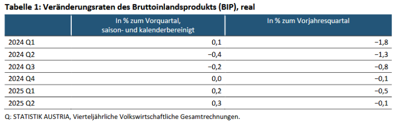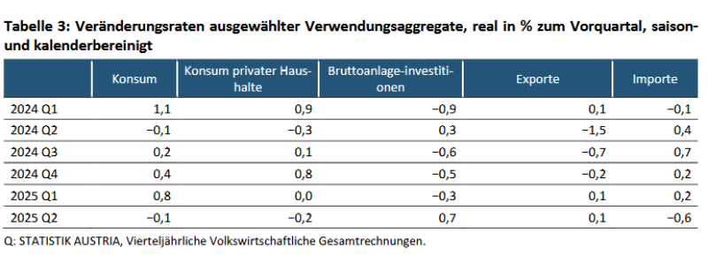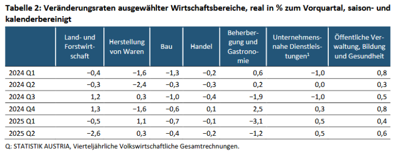 "Im zweiten Quartal 2025 war das reale Bruttoinlandsprodukt mit −0,1 Prozent zwar noch etwas niedriger als im zweiten Quartal des Vorjahres, mit +0,3 Prozent lag die heimische Wirtschaftsleistung jedoch zum zweiten Mal in Folge leicht über dem Niveau des Vorquartals. Von einer stabilen Wachstumsphase kann vor allem aufgrund der verhaltenen oder weiterhin rückläufigen Dynamik in einzelnen Wirtschaftsbranchen sowie bei Konsum und Außenhandel aber noch nicht ausgegangen werden", sagt Manuela Lenk, fachstatistische Generaldirektorin von Statistik Austria.