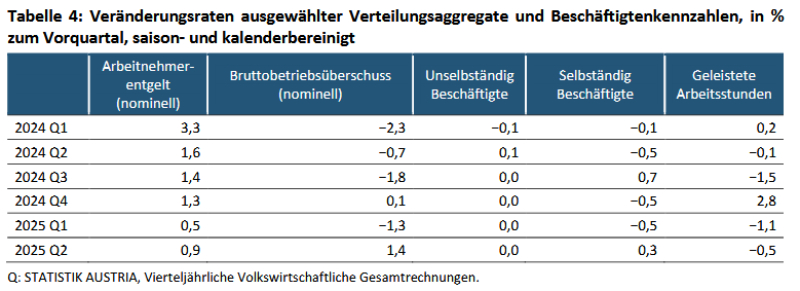 Das nominelle Arbeitnehmerentgelt erhöhte sich im zweiten Quartal 2025 gegenüber dem Vorquartal um 0,9 Prozent. Die Zahl der unselbständig Beschäftigten blieb – wie bereits seit Mitte 2024 – unverändert. Bei den Selbständigen war nach zwei rückläufigen Quartalen wieder ein leichtes Plus von 0,3 Prozent zu verzeichnen.