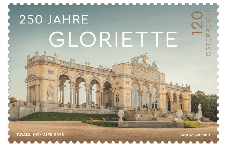 Diese Gloriette wurde im 18. Jahrhundert nach einem Entwurf von Ferdinand Hetzendorf von Hohenberg im Zuge der von ihm im Auftrag Maria Theresias durchgeführten klassizistischen Umgestaltung des Schönbrunner Schlossparks als dessen Abschluss errichtet. Der Baukörper besteht aus einem triumphbogenartigen Mittelteil und aus seitlichen rundbogigen Arkadenflügeln. Der verglaste Mittelteil wird von einem Reichsadler auf der Weltkugel, der von Waffentrophäen umgeben ist, geziert. Und von einer Balustrade eingefasst, dient das Flachdach als Aussichtsplattform – schon seit dem Beginn des 19. Jahrhunderts. Im Zweiten Weltkrieg wurde sie durch Bombentreffer schwerbeschädigt, doch bereits 1947 wieder saniert. Der heutige Anblick der Gloriette, eingebettet in dem historischen Anwesen, ist so imposant, dass er als Motiv für Postkarten dient. Nun, zum 250. Bestehen, wird ihr nochmals eine Ehrung zuteil. Denn anlässlich des Jubiläums bekommt die Sehenswürdigkeit eine eigene Sonderbriefmarke von der Österreichischen Post
