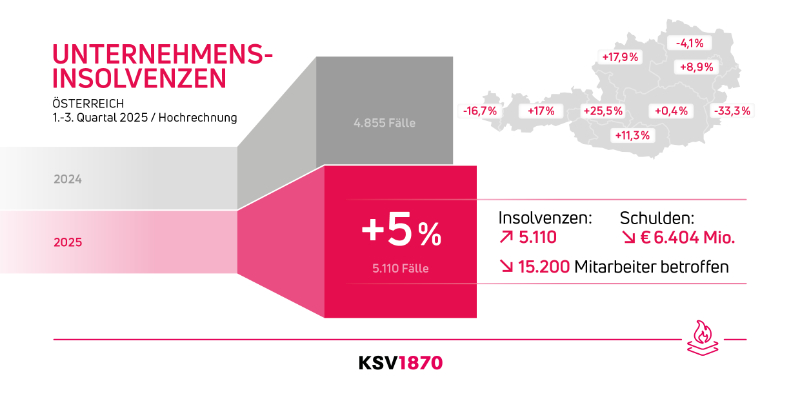 Die Gefahr eines dritten Rezessionsjahres in Folge besteht in Österreich weiterhin, da die Unternehmen unverändert unter hohem finanziellem Druck stehen. Zwar zeigen sich erste Anzeichen einer leichten Stabilisierung der Wirtschaft, diese reichen jedoch nicht aus, um die Insolvenzwelle zu stoppen. Somit ist die Zahl der Unternehmensinsolvenzen bis Ende des dritten Quartals 2025 im Jahresvergleich um 5,3 Prozent auf insgesamt 5.110 Fälle gestiegen.