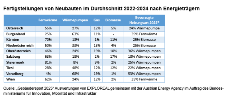 Fertigstellungen von Neubauten im Durchschnitt 2022.2024 nach Energieträgern © "Gebäudereport 2025" Auswertungen von Exploreal gemeinsam mit der Austrian Energy Agency im Auftrag des Bundesministeriums für Innovation, Mobilität und Infrastruktur