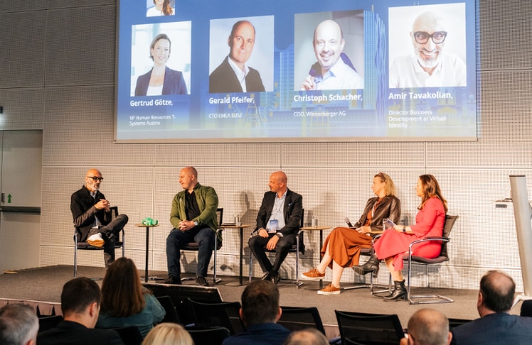 Beim C-Level-Panel "AI in Zero Outage – How to Keep Trust, Talent and Technology Aligned" diskutierten Gertrud Götze (T-Systems Austria), Gerald Pfeifer (SUSE), Christoph Schacher (Wienerberger AG) und Amir Tavakolian (Virtual Identity) unter der Moderation von Ursula zur Nieden (T-Systems International).