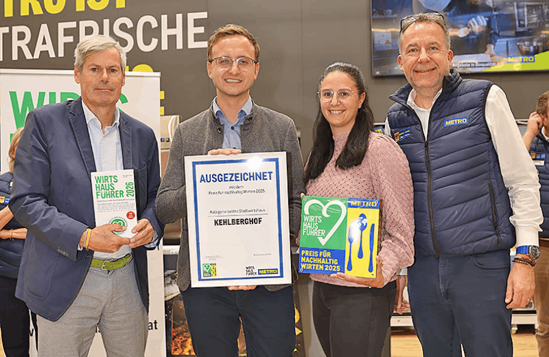 Das "Gasthaus Kehlberghof" wurde wiederum ausgewählt, weil Michael Winkler ein "Nachhaltigkeitskonzept des Machbaren" verfolge. Ein bestehendes Gebäude mit gewachsenen Strukturen biete andere Herausforderungen als ein neues, bei dem man schon in der Planung vieles richtig machen kann. Winkler baue daher keine Luftschlösser, sondern drehe gemeinsam mit seinem Team stets an vielen Rädchen, die aber in Summe große Veränderungen ergeben. "Nachhaltigkeit ist bei uns über viele Jahre gewachsen. Mit viel Einsatz, Konsequenz und Teamgeist. Als Familienbetrieb mit langer Geschichte und starkem Zukunftswillen sehen wir es als unsere Aufgabe, heute schon für morgen mitzudenken: in der Auswahl unserer Produkte, im Umgang mit Energie und Ressourcen, in der Verantwortung für unsere Mitarbeiter:innen und im ehrlichen, transparenten Dialog mit unseren Gästen. Wir kaufen vieles direkt bei Bäuer:innen und Produzent:innen aus der Region, mit denen wir oft schon über viele Jahre zusammenarbeiten. Gleichzeitig schätzen wir die langjährige Partnerschaft mit Metro, einem Handelspartner in unmittelbarer Nachbarschaft, der uns mit top Ware, professionellem Service und nachhaltigen Sortimenten unterstützt", meint Winkler.