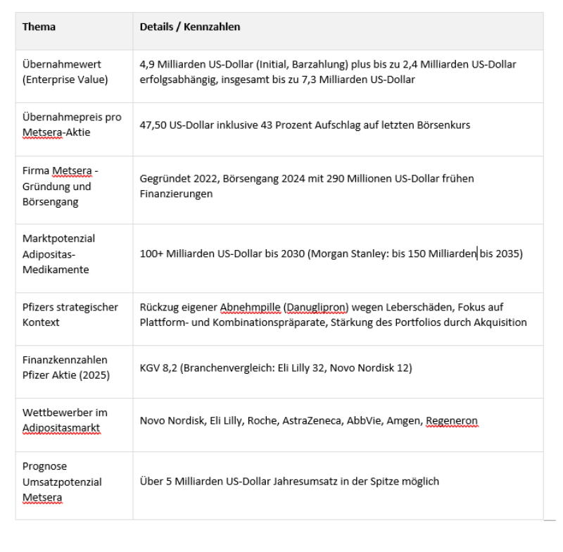 Mit dem Kauf des Biotech-Unternehmens Metsera für bis zu 7,3 Milliarden US-Dollar positioniert sich Pfizer im vielleicht lukrativsten Segment der modernen Medizin. Der Schritt ist bemerkenswert, denn nach dem Fehlschlag der eigenen Abnehmpille galt Pfizer als abgeschlagen. Nun greift der Konzern jene Konkurrenten an, die den Markt dominieren: Novo Nordisk mit Wegovy und Eli Lilly mit Zepbound.
