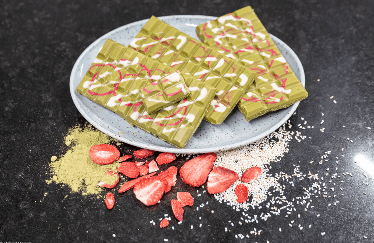 Passend zur grün-roten Farbkulisse der Weihnachtszeit holt die Billa Plus Marktkonditorei eine neue, handgemachte Schokoladensorte ins Sortiment, die sich optisch ins Schema einfügt. Denn die neue "Matcha Strawberry" zeigt sich in grüner schokoladigen Hülle, akzentuiert mit weißen und roten Highlights, hinter denen sich eine Kombination aus weißer Schokolade, einer Matcha-Füllung, Amaranth, getrockneten Erdbeeren und Puffreis versteckt.