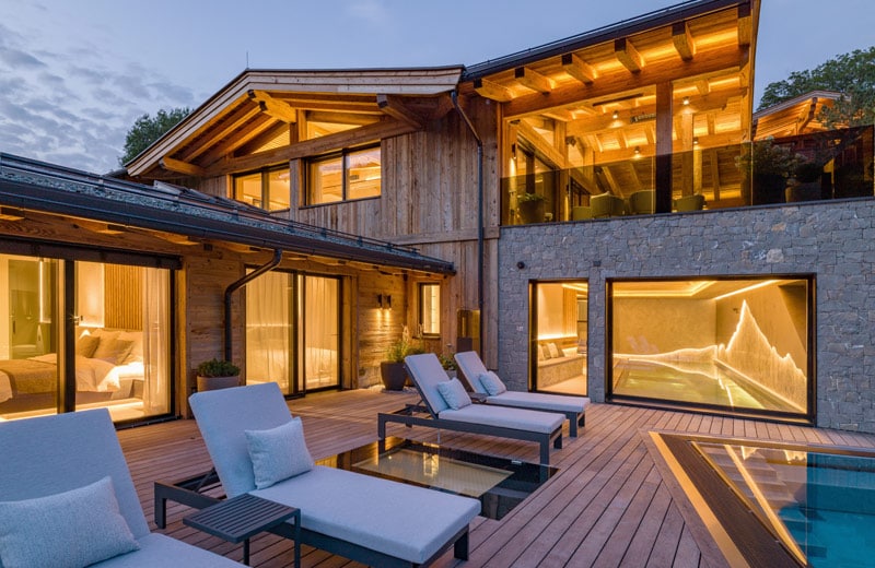 Nur wenige Kilometer entfernt von "the hills" befindet sich eine weitere außergewöhnliche Liegenschaft in Reith. Diese umfasst zwei eigenständige Chalets und bietet insgesamt mehr als 1.100 Quadratmeter Wohnfläche. Neben einem Indoorpool und großzügigen Wellnessbereichen besticht das Anwesen durch seine atemberaubende Aussicht auf den Wilden Kaiser und die Nähe zum exklusiven Kitzbüheler Country Club.