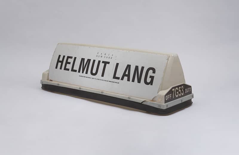 1998 wagte Lang einen Schritt, der heute selbstverständlich erscheint, damals aber revolutionär war: Er präsentierte als erster Designer eine Runway-Show online. Um die neue Website zu bewerben, ließ er rund 1.000 Werbeanzeigen auf New Yorker Taxi-Tops platzieren – die leuchtenden "Helmut Lang"-Schilder wurden zum Markenzeichen der Stadt. Zwei dieser originalen Taxi-Tops sind in der Ausstellung zu sehen, ergänzt durch Werbematerialien, Prototypen und interne Unterlagen aus dem umfangreichen MAK Helmut Lang Archiv.