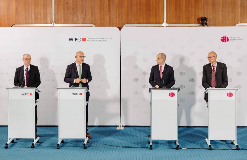 Österreichs Wirtschaft sieht Licht am Ende des Tunnels. Nach der Stagnation der vergangenen Jahre dürfte sie allmählich wieder auf einen moderaten Wachstumspfad einschwenken. Sowohl das Österreichischen Institut für Wirtschaftsforschung (Wifo) als auch das Institut für Höhere Studien (IHS) rechnen für die Jahre 2026 und 2027 mit einem spürbaren, wenn auch gedämpften Konjunkturaufschwung. Präsentiert wurden die Prognosen am Donnerstag in Wien von Wifo-Direktor Gabriel Felbermayr, Wifo-Prognoseverantwortlicher Stefan Ederer, IHS-Direktor Holger Bonin und IHS-Prognoseverantwortlicher Klaus Weyerstraß.