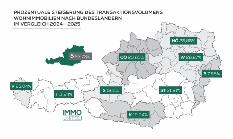 Entwicklung des Transaktionsvolumens österreichischer Wohnimmobilien auf Bundeslandebene im Jahresvergleich 2024 – 2025 © IMMOunited GmbH