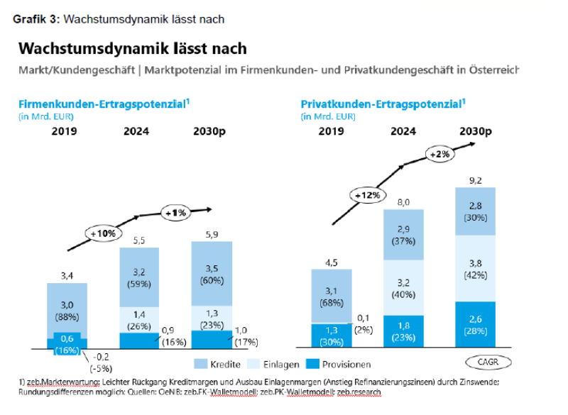Insgesamt sieht zeb die Regionalbanken derzeit weiterhin solide aufgestellt, auch aufgrund einer nach wie vor ausreichenden Eigenkapitalausstattung. Dennoch wird die Zukunft laut Studie schwieriger: Bis 2030 dürfte das Wachstum des Ertragspotenzials sowohl im Firmenkundengeschäft als auch im Privatkundengeschäft deutlich geringer ausfallen als in der Periode 2019 bis 2024. Als weiterer Einflussfaktor wird ein nur schwach positives Wirtschaftswachstum genannt, vorausgesetzt, die aktuellen Prognosen bewahrheiten sich.
