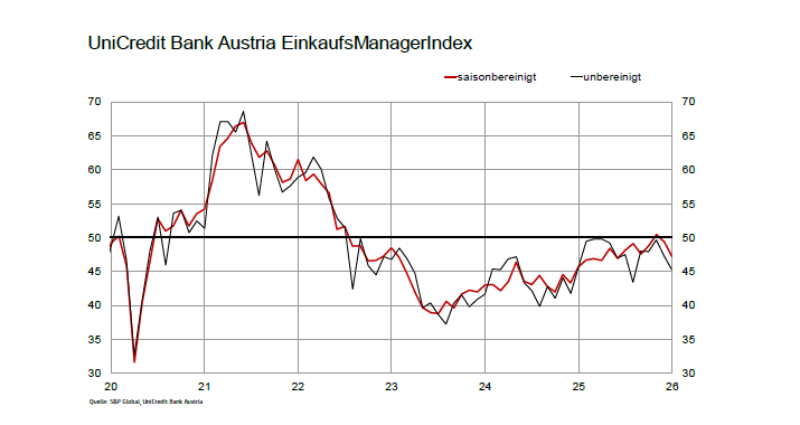 Auch am Arbeitsmarkt zeigt sich weiterhin keine Entspannung. Nachdem sich Ende 2025 vorsichtige Signale einer Stabilisierung abgezeichnet hatten, beschleunigte sich der Beschäftigungsabbau zu Jahresbeginn wieder. Der Beschäftigtenindex fiel im Jänner auf 45,1 Punkte. Damit weist der Index bereits seit Mai 2023 ununterbrochen auf Jobverluste hin. In der Sachgütererzeugung ist die Zahl der Beschäftigten laut UniCredit Bank Austria mittlerweile um fast 27.000 Personen beziehungsweise rund vier Prozent zurückgegangen.