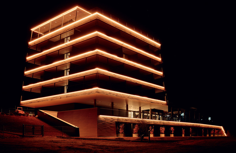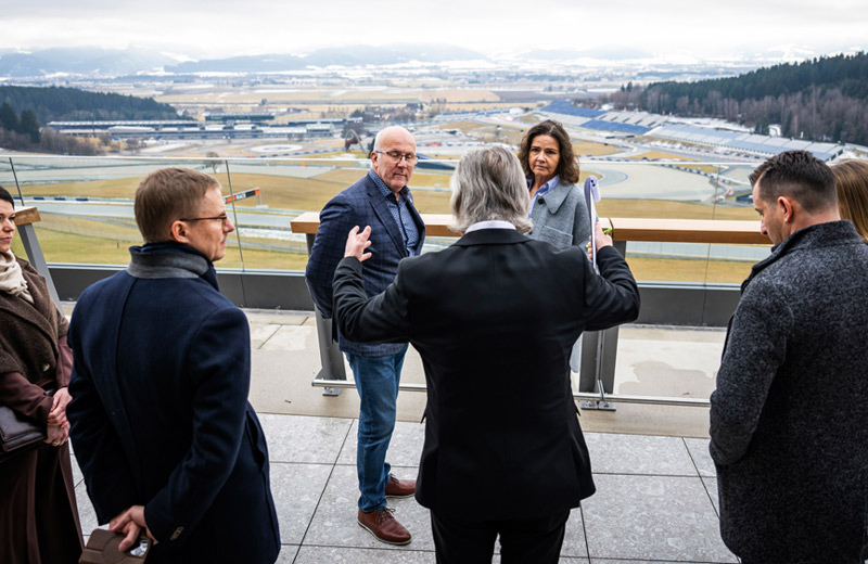 Architektonisch zielte die Erweiterung darauf ab, ein geschlossenes Gesamtensemble zu schaffen, erläutert Architekt Roland Heindl vom Büro Domenig & Wallner. Die vertikale Erweiterung im Westen diene der optimalen Ausrichtung auf Rennstrecke und Murtalblick. Funktionsbereiche wurden weitgehend in die Hangstruktur integriert. Der würfelförmige Neubau greift mit Lärchenholz, Aluminium-Elementen und raumhohen Glasflächen eine einheitliche Fassadensprache auf.