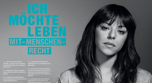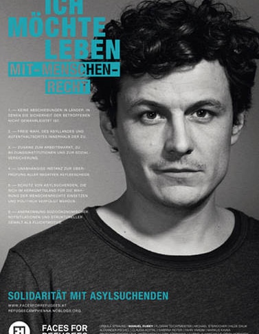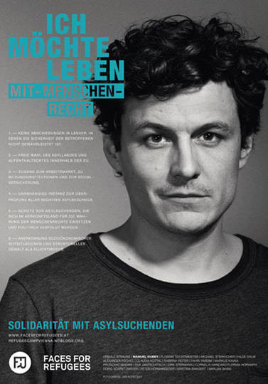 Mit dem Slogan „Ich möchte leben. Mit – Menschen – Recht“ machen derzeit Infoscreens an Haltestellen auf die Situation der Flüchtlinge in Österreich aufmerksam. Ins Leben gerufen hat diese Kampagne Schauspielerin Cornelia Ivancan, finanziert wird sie durch Spendengelder. Manuel Rubey, Marjan Shaki, Hilde Dalik, Ursula Strauss, Dirk Stermann, Alexander Pschill und Markus Kavka posierten dafür vor der Kamera des Berliner Fotografen Jan Kopetzky.