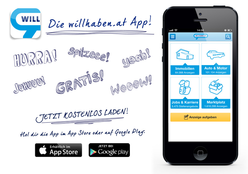 Das größte digitale Einkaufszentrum Österreichs, willhaben.at, ist seit 1. Juli des Jahres mit einer eigenen App auf dem mobilen Markt vertreten. Nach nur zwei Monaten nutzen bereits rund 350.000 ÖsterreicherInnen die für iOS und Android verfügbare Applikation. Die enorme Reichweite des Kleinanzeigen-Portals, welches übrigens österreichischer Marktführer in den beiden Bereichen Auto&Motor und Immobilien ist, schlägt sich auch in den Besucherzahlen auf der App nieder. So generieren täglich durchschnittlich über 43.000 Besucher rund 75.000 Visits auf dem mobilen Portal, was wiederum für 1,7 Mio. Page Impressions pro Tag sorgt.