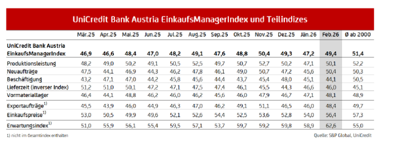 Am Mittwoch veröffentlichte die UniCredit Bank Austria ihren Einkaufsmanagerindex für Februar. Der aktuelle Wert signalisiert, dass sich die österreichische Industrie nach einem verhaltenen Jahresbeginn schrittweise stabilisiert.