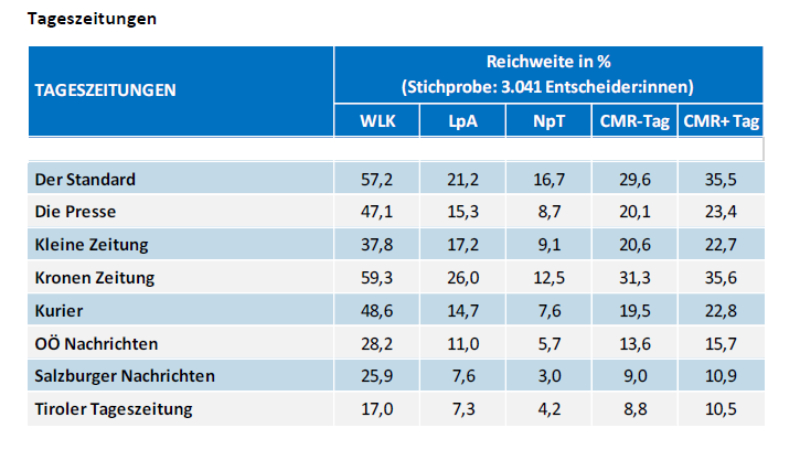 Bei den Tageszeitungen liegt die Kronen Zeitung vor dem DerStandard, sowohl im "Weitester Leserkreis - WLK" als auch bei "Leser:innen pro Ausgabe - LpA" und dem "Cross-Media-Reach/Tag - CMR-Tag".