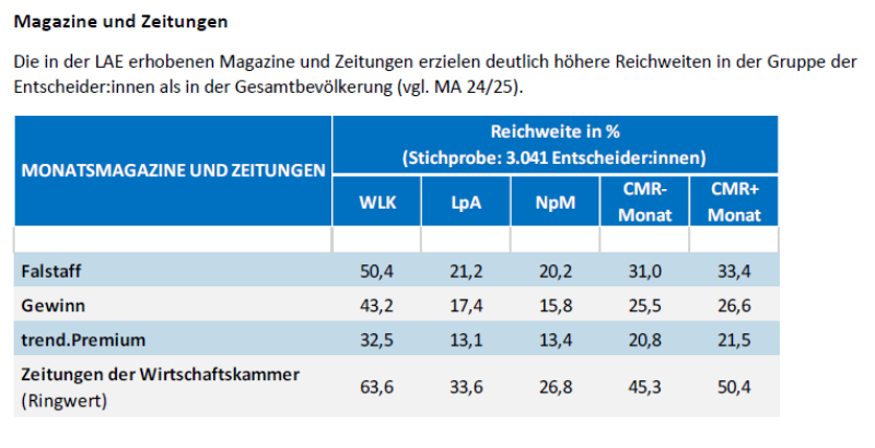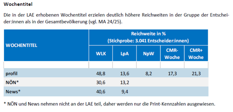 Bei den Wochenzeitungen hat profil die meisten Leser:innen vor NÖN und News. Im Segment der Monatsmagazine und Zeitungen liegen die Zeitungen der Wirtschaftskammer mit einer crossmedialen Reichweite von 45,3 Prozent an der Spitze. Dahinter folgen Falstaff mit 31 Prozent sowie Gewinn mit 25,5 Prozent und trend.Premium mit 20,8 Prozent.