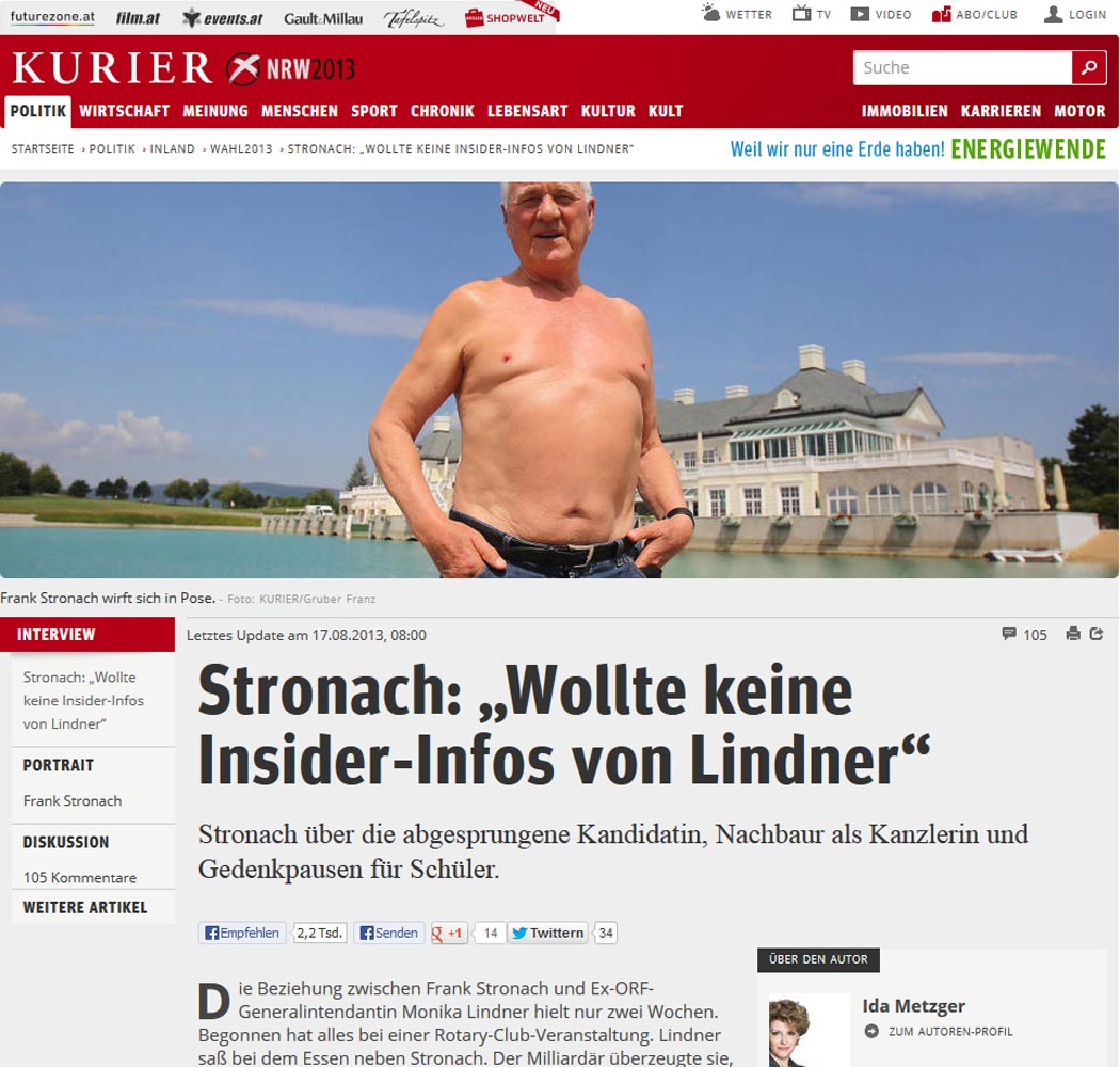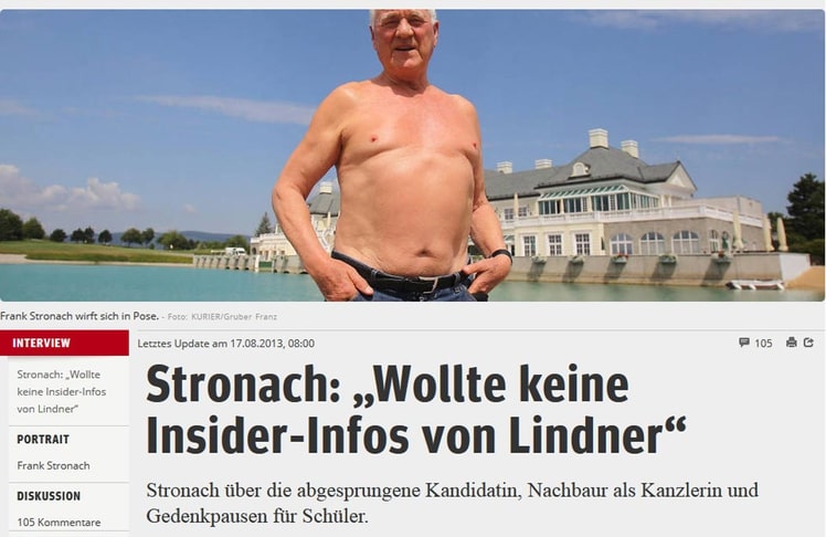 Den ersten medialen Höhepunkt setzte gleich ein Politneuling: Der 80-jährige Frank Stronach posierte beim Interview mit der Tageszeitung Kurier am Fontana-Steg, wahrscheinlich inspiriert von Russlands Präsident Wladimir Putin, mit nacktem Oberkörper. Eine Aktion die sofort Widersacher und FPÖ-Chef HC Strache auf den Plan rief, der nur kurz darauf und noch aus dem Urlaub, ein Foto von sich im knappen Badehöschen auf seinem Facebook-Profil postete. Die beiden Selbstdarsteller mussten für ihre Aktion einiges an Häme einstecken. ZiB-Moderator Armin Wolf fragte etwa auf Twitter: "Für welchen Job kandidiert Frank Stronach eigentlich? Bademeister in Oberwaltersdorf?" Strache wollte die geballte Kritik, die auf ihn einprasselte nicht hinnehmen und nutzte die Gelegenheit um sich gleich mit dem ehemaligen US-Präsidenten John F. Kennedy zu vergleichen, von dem er auch ein Badehosen-Foto postete.
