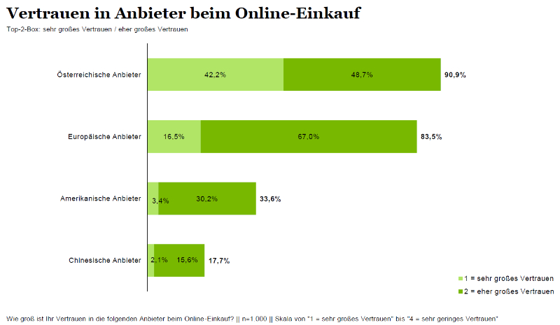 Ein weiterer Aspekt betrifft den Vergleich zwischen europäischen Anbieter:innen und internationalen Plattformen. 78 Prozent der Befragten nehmen deutliche Preisunterschiede wahr. Gleichzeitig zeigt sich ein starkes Vertrauensgefälle: Anbieter:innen aus Österreich und Europa werden deutlich positiver bewertet als etwa chinesische Plattformen.