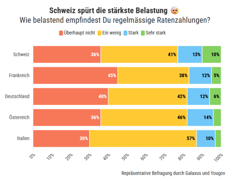 Die Auswertung zeigt nicht nur Unterschiede bei der Nutzung, sondern auch bei der empfundenen Belastung. Am stärksten ausgeprägt ist diese in der Schweiz. Dort empfinden 23 Prozent eine starke oder sehr starke psychische Belastung, wenn sie regelmäßig in Raten zahlen.