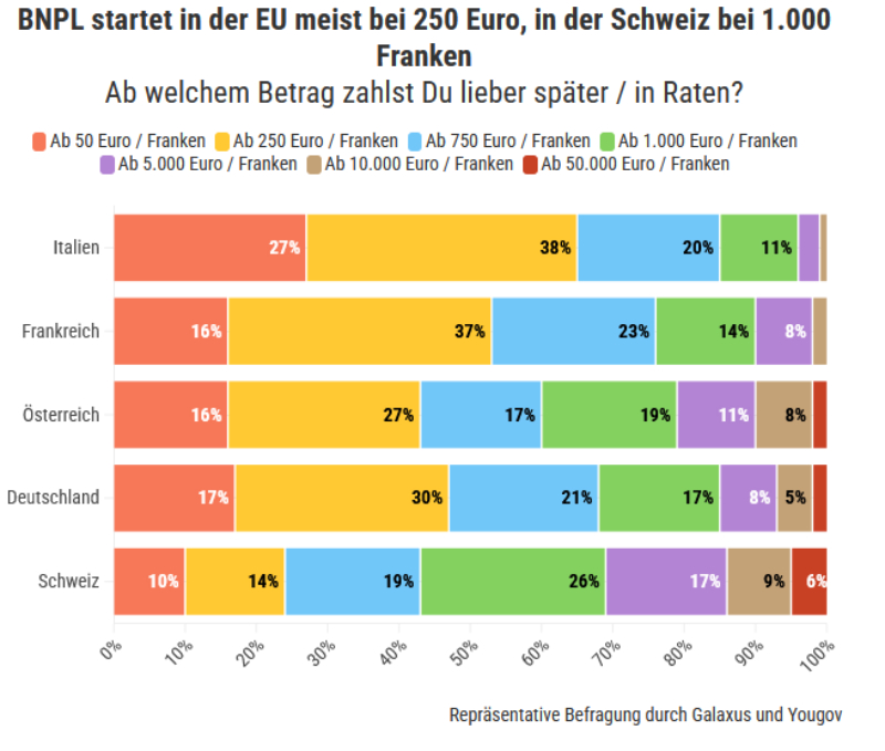 BNPL startet in der EU meist bei 250 Euro, in der Schweiz bei 1.000 Franken © Galaxus und Yougov