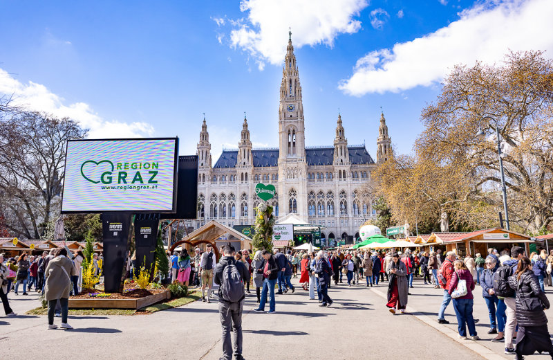 Mit dem Steiermark-Frühling 2026 hat am Wiener Rathausplatz wieder die "grüne Jahreszeit" Einzug gehalten: Bis zum Sonntag, dem 12. April, präsentiert sich das "Grüne Herz Österreichs" in der Bundeshauptstadt nun einmal mehr von seiner genussvollsten Seite. Eröffnet wurde das traditionsreiche Event, das als eines der größten "Pop-up-Restaurants" des Landes gilt, am Donnerstagvormittag bei bestem Wetter und unter prominenter Schirmherrschaft. So gaben Wiens Landtagspräsident Christian Meidlinger, Landeshauptmann Mario Kunasek, Landeshauptmann-Stellvertreterin Manuela Khom sowie Bundesminister Wolfgang Hattmannsdorfer mit dem traditionellen "Küchengong" den offiziellen Startschuss.