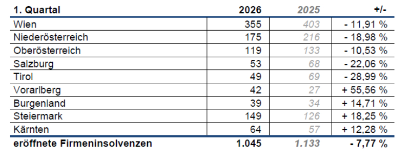 Auch regional zeigt sich ein uneinheitliches Bild. In Wien wurden im ersten Quartal 2026 insgesamt 355 Firmeninsolvenzen eröffnet, nach 403 im Vergleichszeitraum des Vorjahres. Das entspricht einem Rückgang um 11,91 Prozent. In Niederösterreich sank die Zahl von 216 auf 175 Verfahren, was einem Minus von 18,98 Prozent entspricht. Oberösterreich verzeichnete 119 eröffnete Firmeninsolvenzen nach 133 im Vorjahr und damit einen Rückgang um 10,53 Prozent. In Salzburg ging die Zahl von 68 auf 53 Verfahren zurück, was ein Minus von 22,06 Prozent bedeutet. Besonders deutlich fiel der Rückgang in Tirol aus, wo 49 Firmeninsolvenzen eröffnet wurden, nach 69 im ersten Quartal 2025. Das entspricht einem Minus von 28,99 Prozent.
