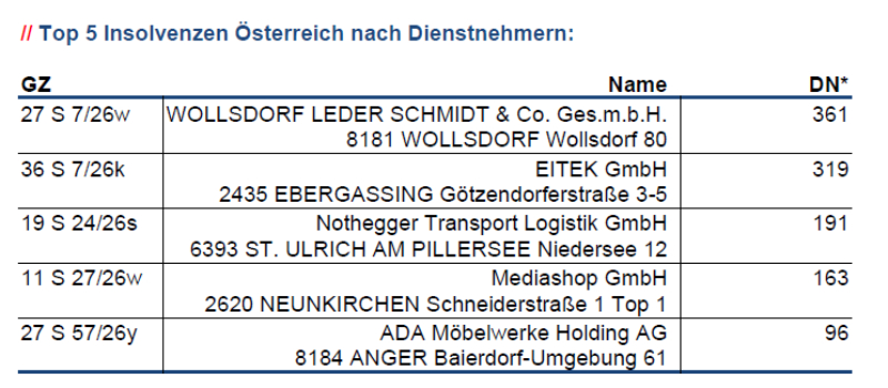 Zu den größten Fällen nach Beschäftigten zählen unter anderem Wollsdorf Leder Schmidt & Co. Ges.m.b.H. (361 Dienstnehmer:innen), Eitek GmbH (319 Dienstnehmer:innen) sowie Nothegger Transport Logistik GmbH (191 Dienstnehmer:innen). Die Top 5 Insolvenzen in Österreich nach Dienstnehmer:innen werden noch durch die Mediashop GmbH (163 Dienstnehmer:innen) und die ADA Möbelwerke Holding AG (96 Dienstnehmer:innen) ergänzt.