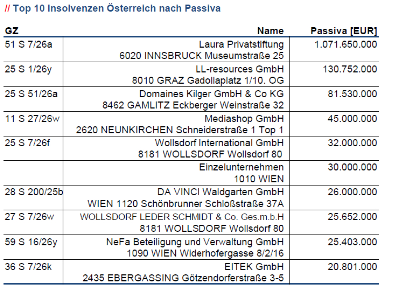 Weitere bedeutende Insolvenzfälle betreffen die Wollsdorf Leder Schmidt & Co. Ges.m.b.H. mit 25.652.000 Euro, die NeFa Beteiligung und Verwaltung GmbH mit 25.403.000 Euro sowie die Eitek GmbH mit 20.801.000 Euro.