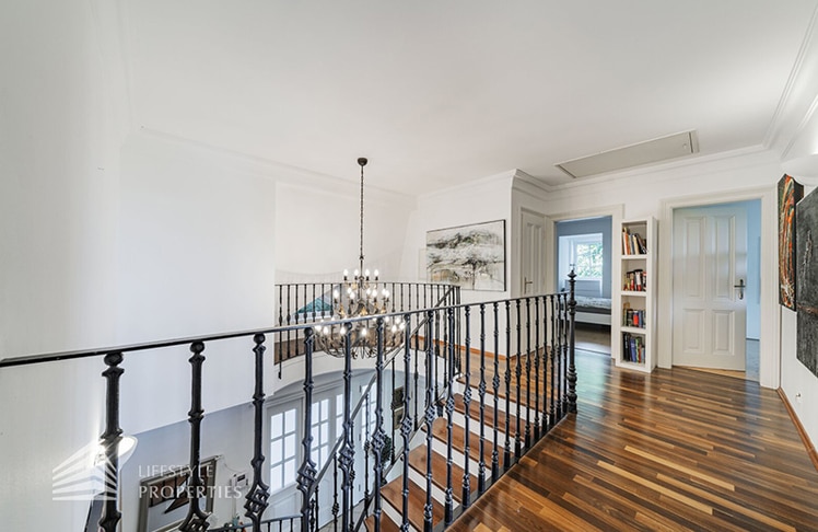 Die stilvolle Treppe führt in das Obergeschoss mit einer zentralen Galerie, von der aus drei Zimmer, ein Schrankraum, ein Badezimmer sowie ein separates WC begehbar sind.