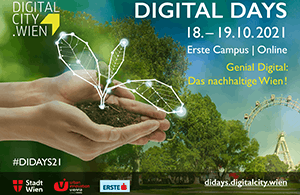 Die Digital Days 2021 stehen unter dem Motto „Genial Digital: Das nachhaltige Wien!“. Expert*innen aus Politik, Verwaltung, Wirtschaft und Wissenschaft beleuchten mit dem Publikum das Zusammenspiel von Digitalisierung und Nachhaltigkeit im Kontext einer smarten Stadtentwicklung. Der Eintritt ist frei! Die Digital Days sind eine gemeinsame Veranstaltung der Stadt Wien, DigitalCity.Wien und Urban Innovation Vienna, ein Unternehmen der Wien Holding, in Kooperation mit der Erste Bank.